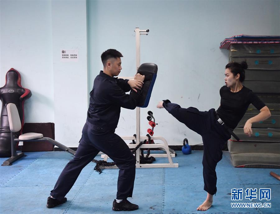 10月16日,湯春燕在健身房?jī)?nèi)進(jìn)行擒敵訓(xùn)練。
