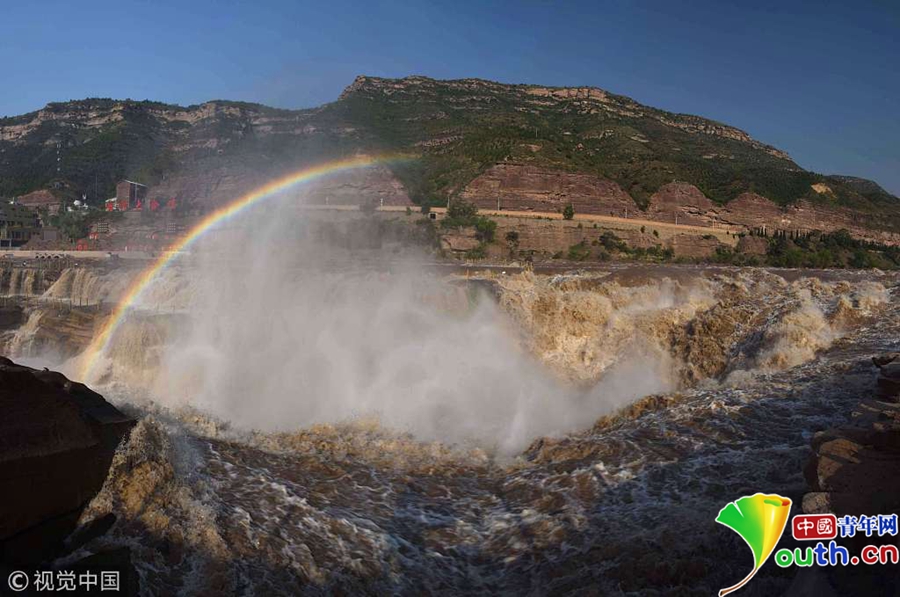 5月31日,山西臨汾奔騰咆哮的黃河壺口瀑布吸引游客。近日,受上游地區(qū)降雨量增多影響,黃河干流晉陜峽谷水量大增,每秒流量達到1100立方,是常年同期的三倍,壺口瀑布出現(xiàn)五月份罕見的瀑布群景觀,吸引了眾多游客。