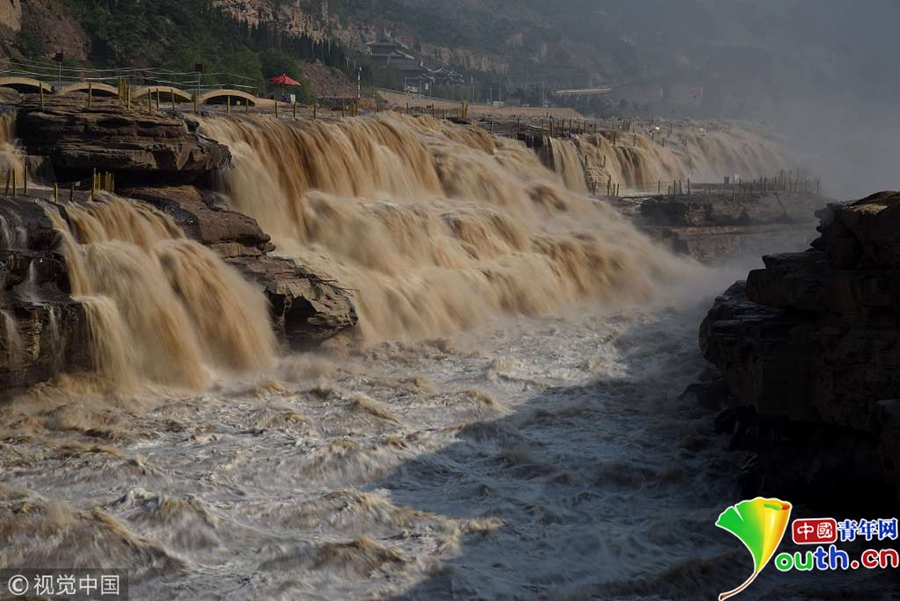 5月31日,山西臨汾奔騰咆哮的黃河壺口瀑布吸引游客。近日,受上游地區(qū)降雨量增多影響,黃河干流晉陜峽谷水量大增,每秒流量達到1100立方,是常年同期的三倍,壺口瀑布出現(xiàn)五月份罕見的瀑布群景觀,吸引了眾多游客。