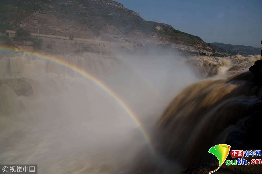 5月31日,山西臨汾奔騰咆哮的黃河壺口瀑布吸引游客。近日,受上游地區(qū)降雨量增多影響,黃河干流晉陜峽谷水量大增,每秒流量達(dá)到1100立方,是常年同期的三倍,壺口瀑布出現(xiàn)五月份罕見(jiàn)的瀑布群景觀,吸引了眾多游客。