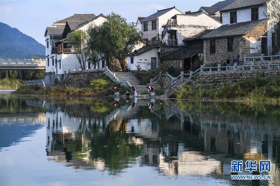 10月17日,河橋鎮(zhèn)的青年黨員們在鎮(zhèn)邊的昌南溪邊巡查,并清理兩岸的廢棄物。新華社記者 徐昱 攝