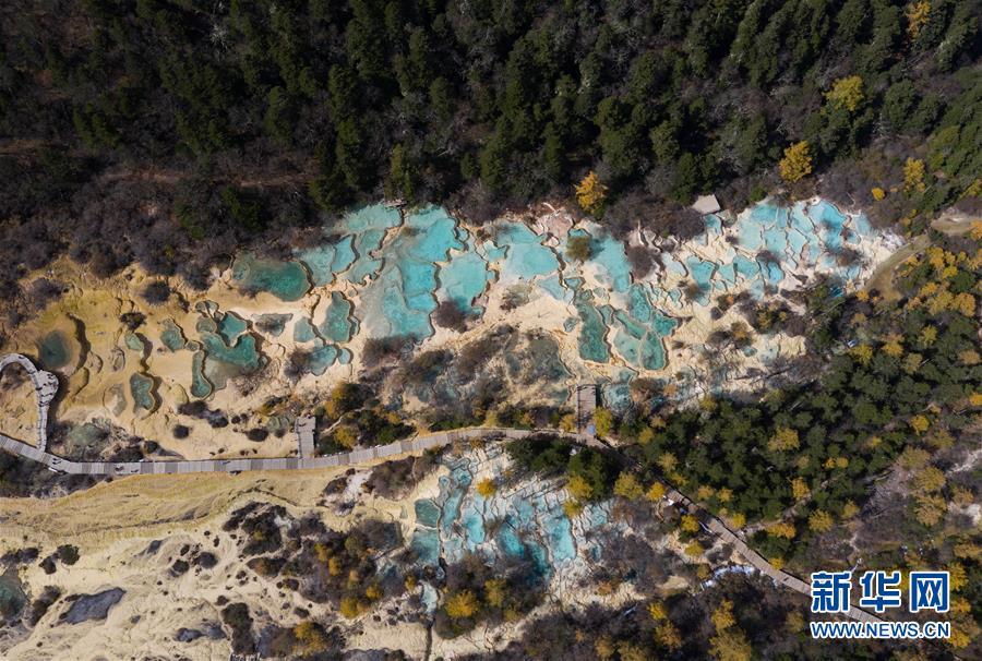 俯瞰黃龍溝爭艷池一角(10月19日無人拍機攝)。深秋時節(jié),在雪山、藍天、白云和彩林映襯下,黃龍溝中的彩池色彩更加斑斕,目前黃龍景區(qū)進入觀賞最佳時節(jié)。黃龍風(fēng)景名勝區(qū)位于四川省松潘縣境內(nèi),以彩池、灘流、雪山、峽谷、森林等聞名,享有“人間瑤池”“圣地仙境”之美譽。新華社記者 江宏景攝