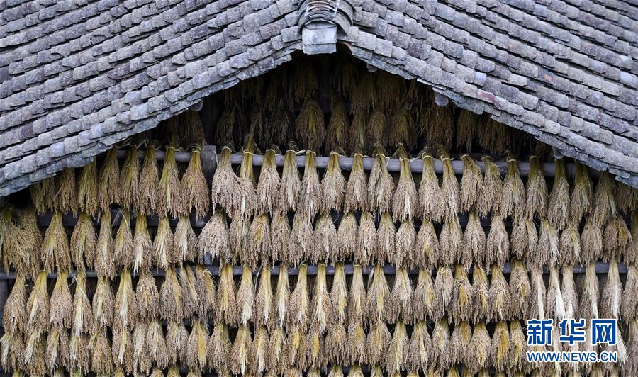 這是貴州省黔東南苗族侗族自治州從江縣高增鄉(xiāng)占里村一處屋檐下晾曬的稻谷(10月17日攝)。 金秋時(shí)節(jié),農(nóng)民們忙著收獲成熟的農(nóng)作物,喜迎豐收。 新華社記者陳曄華攝