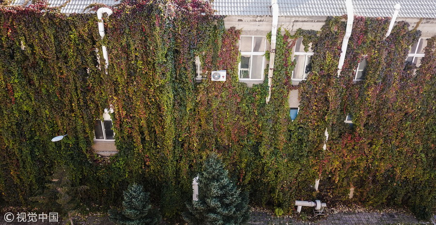 2017年10月21日,沈陽,懷遠樓北側的墻面也是被爬墻虎所覆蓋,由于陽光很少能照射到植被,所以爬墻虎大都還是綠色