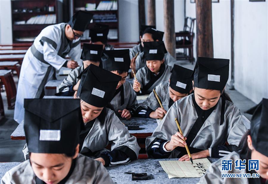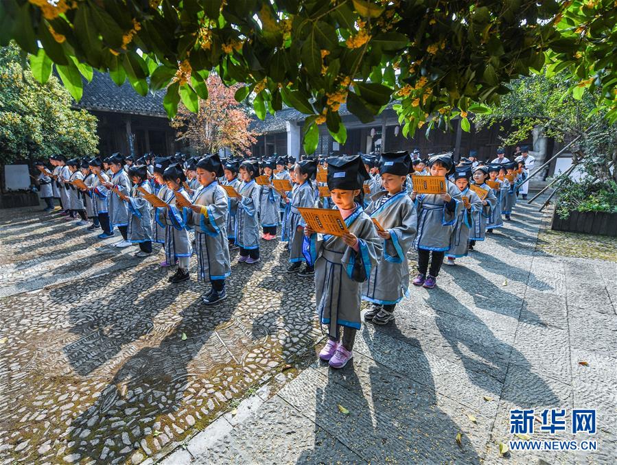 10月23日,學(xué)生們?cè)谡b讀國學(xué)經(jīng)典。當(dāng)日,浙江省長(zhǎng)興縣第八小學(xué)舉行“誦家規(guī)家訓(xùn),傳中華美德”校園“誠敬日”主題教育活動(dòng),通過誦讀國學(xué)經(jīng)典、講勵(lì)志故事、演美德戲劇等形式,讓學(xué)生感受優(yōu)秀傳統(tǒng)文化。近年來,該學(xué)校立足“誠敬”文化,注重國學(xué)啟蒙教育,讓學(xué)生從小培養(yǎng)“以誠立身、以敬處事”的良好品質(zhì)。新華社記者 徐昱 攝