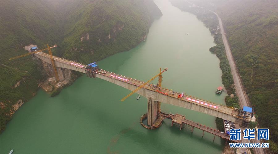 在重慶涪陵拍攝的渝懷鐵路涪秀二線重點(diǎn)工程——烏江右線大橋(10月23日無(wú)人機(jī)拍攝)。 10月23日,由中鐵四局承建的渝懷鐵路涪秀二線重點(diǎn)工程——烏江右線大橋主跨成功合龍,標(biāo)志著大橋主體工程全部順利結(jié)束。烏江右線大橋項(xiàng)目全程460.1米,主跨192米,跨越烏江和319國(guó)道。在兩年多的建設(shè)過(guò)程中,施工人員攻克了“不等高墩”“不對(duì)稱(chēng)邊跨”“邊跨入隧”等多個(gè)技術(shù)難題。 新華社記者王全超攝