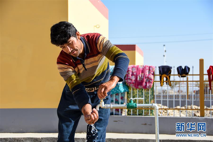 買合肉甫·木拉吧在庭院里洗手。相較于去河里取水,新城里的自來水大大方便了生活(10月28日攝)。新華社記者 關(guān)俏俏 攝