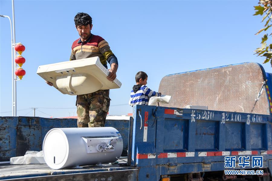 10月28日,買合肉甫·木拉吧在小兒子的幫助下裝運貨物。 新華社記者 關(guān)俏俏 攝