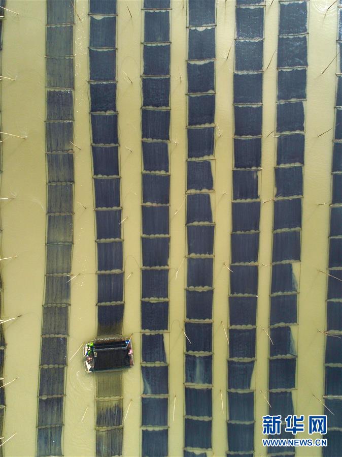 11月4日,漁民在霞浦縣三沙鎮(zhèn)的紫菜種植區(qū)收獲紫菜(無人機拍攝)。 近日,福建省霞浦縣沿海6萬畝紫菜迎來收獲季節(jié),漁民們出海收獲紫菜,海上田園一派繁忙豐收景象。 新華社記者 姜克紅 攝