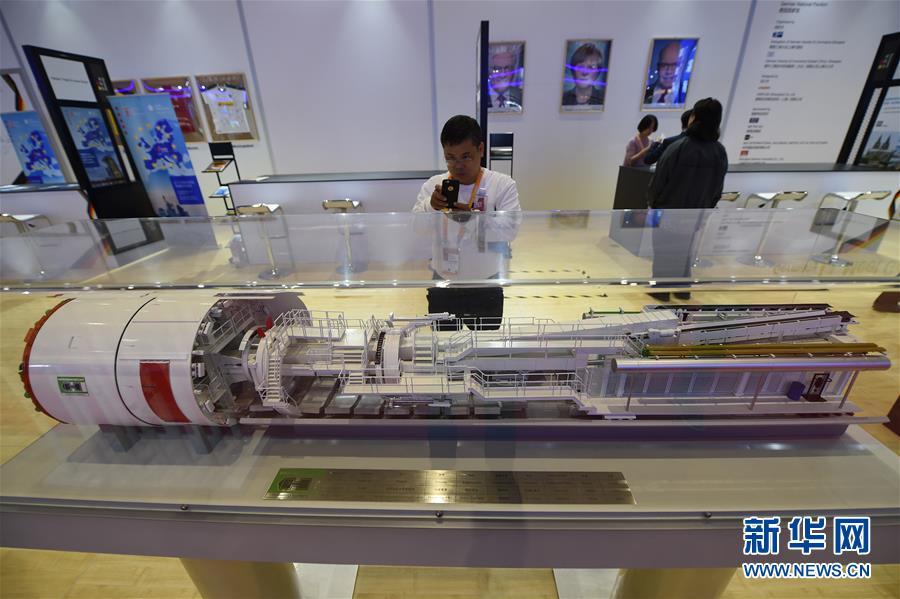 11月5日,一名參觀者在德國展館內拍攝雙護盾盾構機模型。 新華社記者 韓瑜慶 攝
