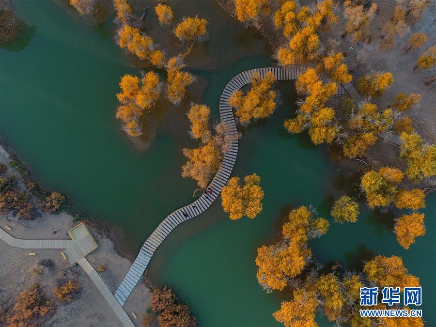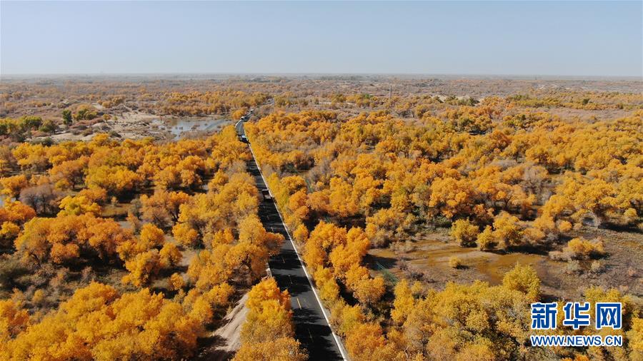 從空中俯瞰新疆尉犁縣喀爾曲尕鄉(xiāng),兩條道路沿著塔里木河岸邊的金色胡楊向前延伸(10月25日無人機拍攝)。 10月中下旬,靜靜的塔里木河中下游一片金黃。胡楊深處,條條小路蜿蜒綿長通向遠方,引人入勝。 塔里木河是中國最長的內(nèi)陸河,這一區(qū)域原始胡楊林分布較為集中。隨著塔里木河連續(xù)19次向下游生態(tài)輸水,為胡楊林“解渴”,塔河兩岸生態(tài)得到明顯改善,沙地面積逐年減少。 新華社記者趙戈攝