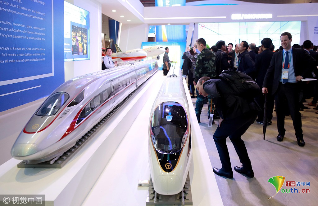 2018年11月6日,上海,首屆中國(guó)國(guó)際進(jìn)口博覽會(huì)國(guó)家展上,共有82個(gè)國(guó)家、3個(gè)國(guó)際組織設(shè)立了71個(gè)展臺(tái)。中國(guó)館展示的復(fù)興號(hào)。視覺(jué)中國(guó)
