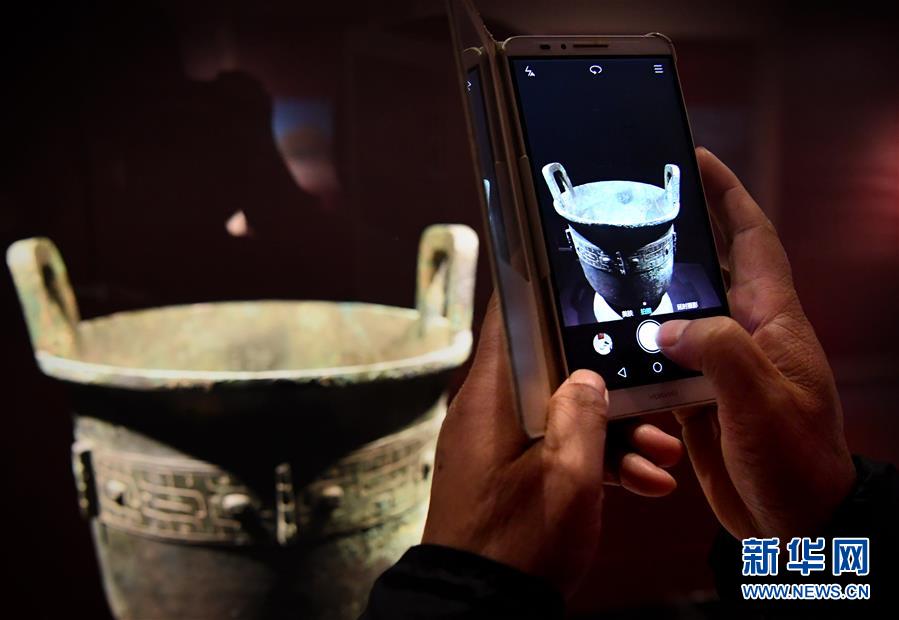 10月12日,參觀者在安陽博物館拍攝展品。目前,“鳳歸大邑商——殷墟婦好文物安陽故里展”正在安陽博物館展出,共展出文物474件。1976年被考古學(xué)家發(fā)現(xiàn)的婦好墓,是世界文化遺產(chǎn)、中國商代后期都城遺址——殷墟唯一保存完整的商代王室墓葬。新華社記者李安攝