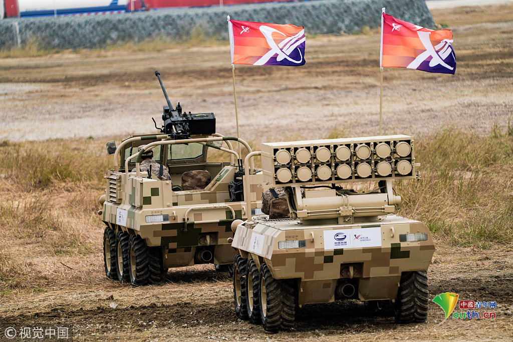2018年11月8日,廣東珠海航展上,中國兵器集團等組織地面的輪式即履帶式的武器裝備,進行地面多種項目動態(tài)展示。視覺中國