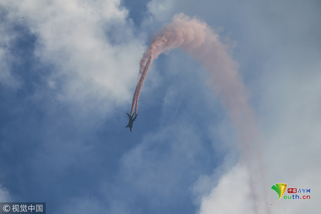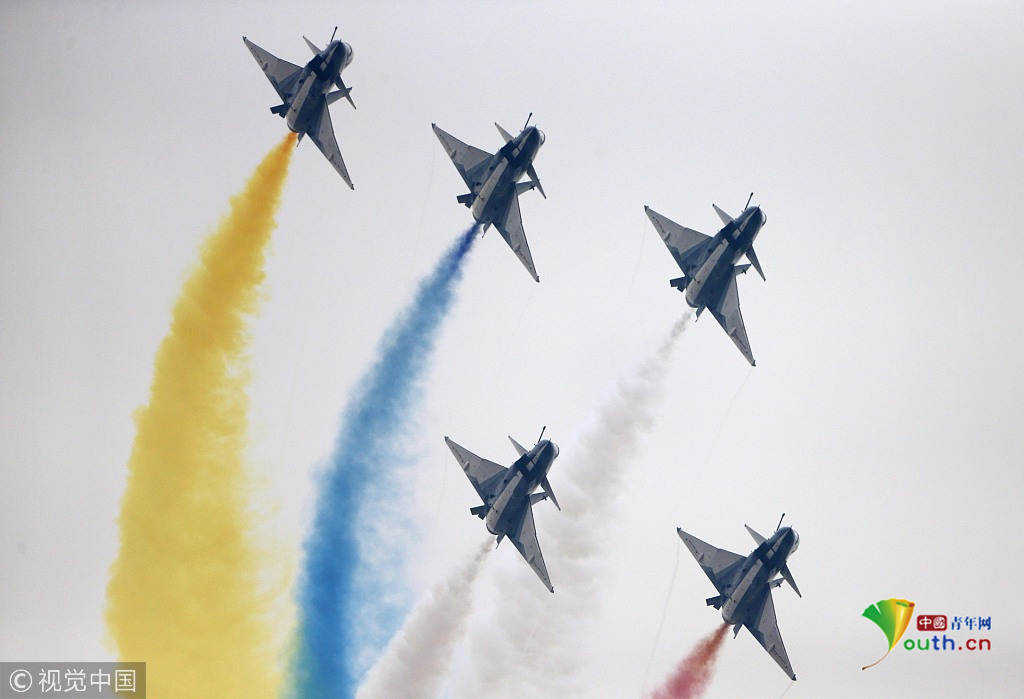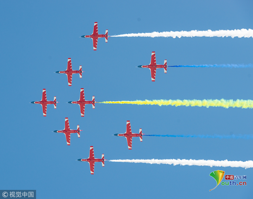 2018年11月8日,廣東珠海,第十二屆中國國際航展第三天。空軍“八一”飛行表演隊的隊員們,發(fā)揚連續(xù)作戰(zhàn)精神,給觀眾們表演了七機分組開花、四機編隊橫滾等高難動作,受到觀眾們的稱贊。視覺中國