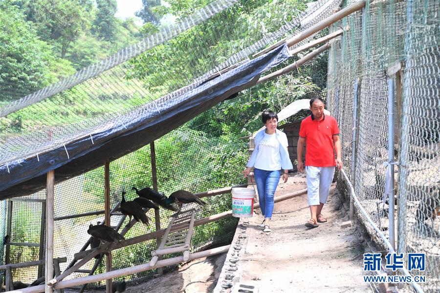 5月16日,在重慶市銅梁區(qū)永嘉鎮(zhèn)高龍村,閻仁兵(右)和妻子張榮蘋在養(yǎng)殖場(chǎng)內(nèi)巡視藍(lán)孔雀生長情況。