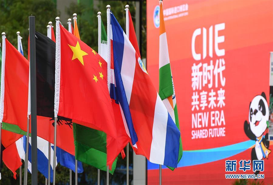 11月5日,在上海國(guó)家會(huì)展中心入口處,旗幟迎風(fēng)飄揚(yáng)。新華社記者 李賀 攝