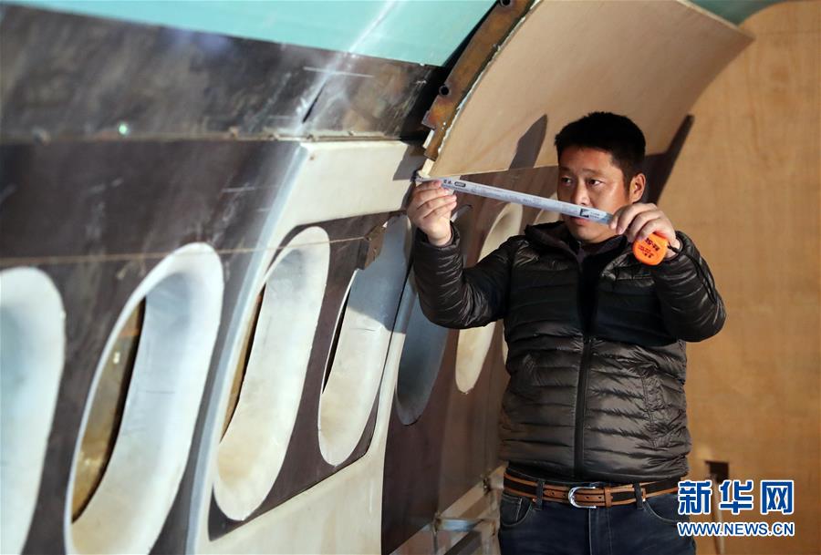 11月10日,在遼寧開原老城街道前三臺子村,朱躍在“飛機(jī)”內(nèi)部測量安裝尺寸。 新華社記者 楊青 攝