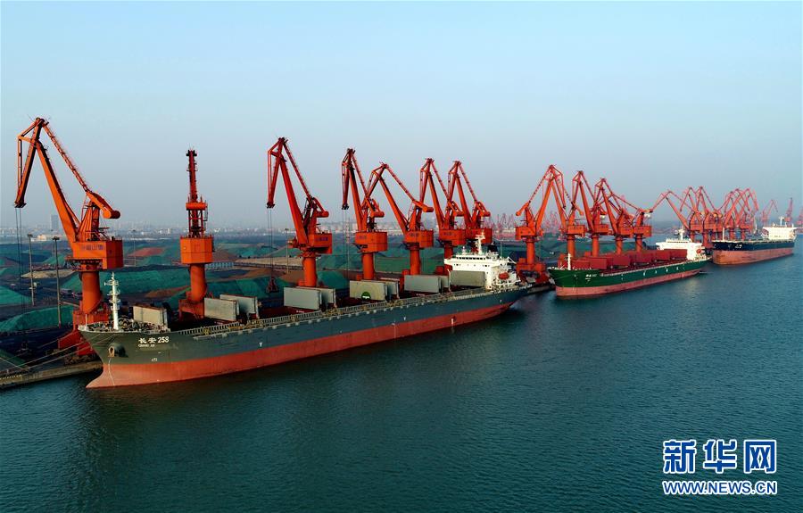輪船靠泊在唐山港京唐港區(qū)散貨碼頭卸載(11月12日無(wú)人機(jī)拍攝)。記者從河北省交通運(yùn)輸廳港航管理局獲悉,今年1至10月,河北港口完成貨物吞吐量達(dá)9.5億噸,同比增長(zhǎng)4.3%。 新華社記者 楊世堯 攝