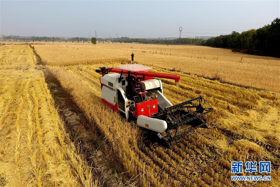 在太原市晉源區(qū)赤橋村,收割機(jī)在稻田里作業(yè)(10月17日無人機(jī)拍攝)。近日,山西省太原市晉源區(qū)2000多畝水稻迎來收割季。 金秋時(shí)節(jié),農(nóng)民們忙著收獲成熟的農(nóng)作物,喜迎豐收。 新華社記者 詹彥 攝
