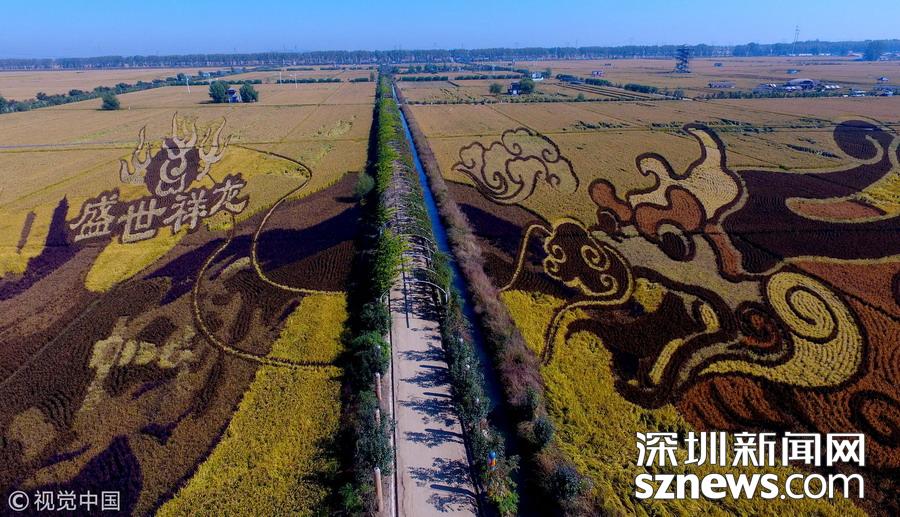 遼寧沈陽(yáng),金秋時(shí)節(jié),沈陽(yáng)盛世祥龍、千手觀音、孔子、厲害啦我的國(guó)、求婚等主題總面積680畝、共15幅具有3D效果的巨幅稻田畫(huà)迎來(lái)最佳觀賞期。