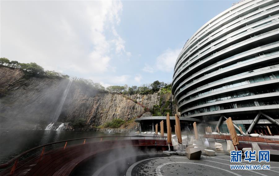 一條人造瀑布從酒店主體建筑旁的礦坑頂部流下(11月13日攝)。 位于上海松江的世茂洲際酒店11月15日正式開門營(yíng)業(yè)。這家在一個(gè)廢棄采石礦坑內(nèi)建成的酒店成為上海又一新景。 新華社記者 方喆 攝