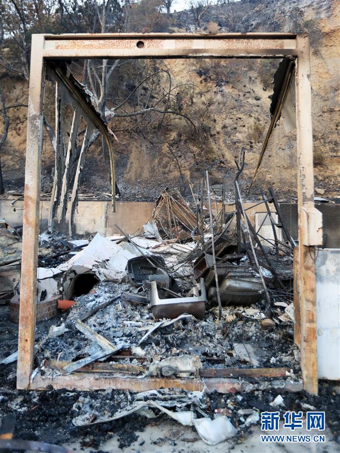 這是11月10日在美國加利福尼亞州馬里布市拍攝的一輛被燒毀的汽車。連日來,美國加利福尼亞州野火肆虐。 新華社記者李穎攝