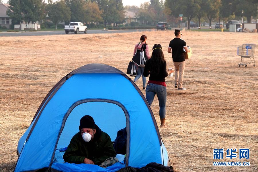 11月18日,在美國加利福尼亞州比尤特縣奇科,災(zāi)民在沃爾瑪停車場搭起帳篷暫居。 新華社記者吳曉凌攝