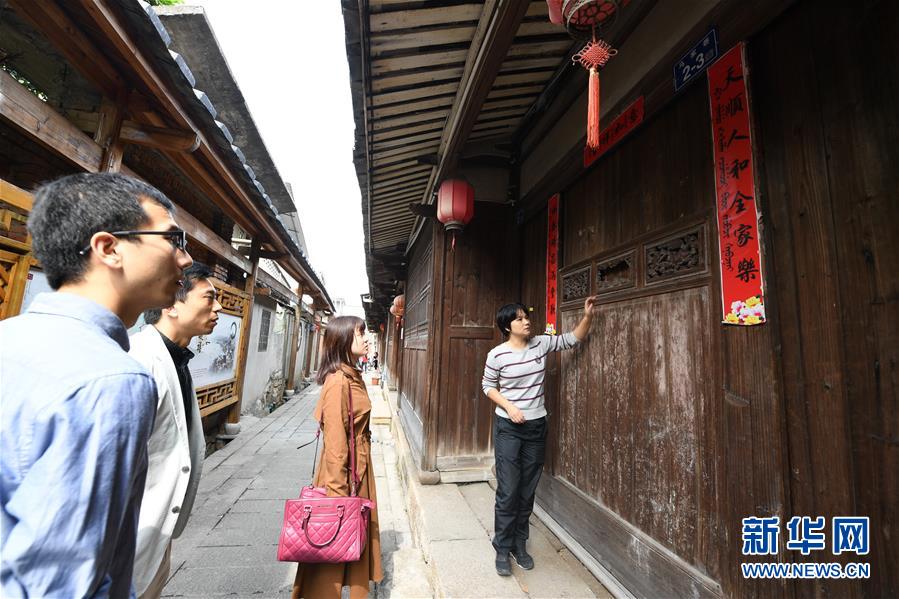 10月27日,琴江滿族村游客服務(wù)中心的鄭閩瓊(右一)向游客介紹三江口清朝水師旗營古兵房建筑特色。福州市長樂區(qū)琴江滿族村是福建省唯一的滿族聚居村,也是我國東南沿海保存較為完整的清代水師城堡。清雍正六年(1728年)時(shí),清政府在此建立“福州三江口水師旗營”,鎮(zhèn)守閩江口,拱衛(wèi)省城,緝捕海盜,打擊走私。這里成為當(dāng)時(shí)全國四大水師旗營之一,隨后逐漸成為一個(gè)居民小鎮(zhèn)。有近300年歷史的琴江村既有軍事歷史背景,又有民族文化特色,2010年成為“中國歷史文化名村”。新華社記者 林善傳 攝