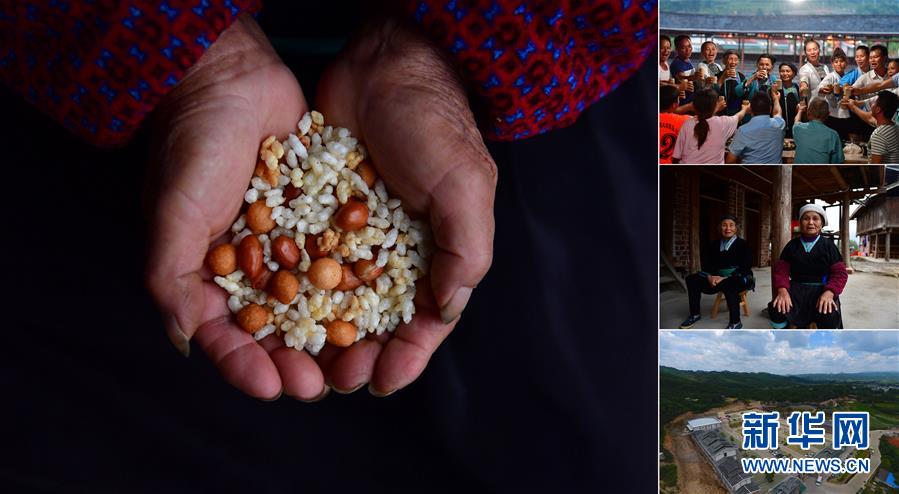 拼版照片:左圖為在廣西融水雙龍溝森林旅游度假區(qū)夢(mèng)嗚苗寨,70歲的韋院媽手捧油茶原料:花生、油果、蔭米(11月20日攝);右上圖為韋院媽?zhuān)ㄗ罅┰诰皡^(qū)里和游客們一起歡度苗族新禾節(jié)(7月18日攝);右中圖為韋院媽?zhuān)ㄓ遥┰诩依镄菹ⅲ?1月20日攝);右下圖為夢(mèng)嗚苗寨(7月19日無(wú)人機(jī)拍攝)。韋院媽是桿洞鄉(xiāng)錦洞村的貧困戶,今年3月,她和村里的13戶貧困戶一起舉家搬到雙龍溝森林旅游度假區(qū)打造的夢(mèng)嗚苗寨,景區(qū)將貧困戶引入苗寨生活工作,保證貧困家庭有穩(wěn)定的收入。 廣西融水苗族自治縣是國(guó)家扶貧工作重點(diǎn)縣,全縣“九山半水半分田”,生活生產(chǎn)環(huán)境較為惡劣,脫貧攻堅(jiān)任務(wù)艱巨,目前還有7.68萬(wàn)貧困人口。面對(duì)經(jīng)濟(jì)發(fā)展落后、貧困面廣且程度深的現(xiàn)狀,當(dāng)?shù)匕衙撠毠?jiān)與創(chuàng)新產(chǎn)業(yè)扶持相結(jié)合,依托生態(tài)資源優(yōu)勢(shì),實(shí)施“特色產(chǎn)業(yè)富民行動(dòng)”,通過(guò)發(fā)展特色民族旅游、林下經(jīng)濟(jì)和特色養(yǎng)殖業(yè)等扶貧產(chǎn)業(yè),帶動(dòng)貧困群眾依靠勤勞的雙手,拔窮根摘窮帽,實(shí)現(xiàn)脫貧致富。據(jù)了解,目前全縣貧困戶參與特色產(chǎn)業(yè)發(fā)展的有2.9萬(wàn)戶,扶貧產(chǎn)業(yè)覆蓋率達(dá)95%。 新華社記者 黃孝邦 攝