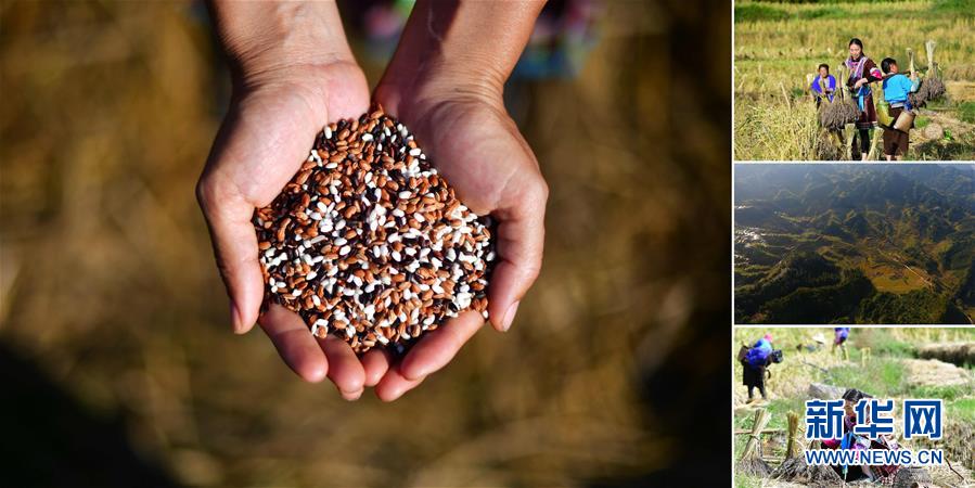 拼版照片:左圖為在安太鄉(xiāng)元寶村,80歲的賈榮專手捧剛剛收獲的香糯;右上圖為成熟待收的香糯;右中圖為賈榮專(左)在收割香糯;右下圖為村民們?cè)谑障闩矗ㄕ掌鶖z于10月30日)。2017年,賈榮專加入村里的香糯種植合作社。香糯是廣西融水大苗山的特產(chǎn),它生長(zhǎng)在高寒高海拔的特殊自然環(huán)境中,產(chǎn)量少,營養(yǎng)價(jià)值高。 廣西融水苗族自治縣是國家扶貧工作重點(diǎn)縣,全縣“九山半水半分田”,生活生產(chǎn)環(huán)境較為惡劣,脫貧攻堅(jiān)任務(wù)艱巨,目前還有7.68萬貧困人口。面對(duì)經(jīng)濟(jì)發(fā)展落后、貧困面廣且程度深的現(xiàn)狀,當(dāng)?shù)匕衙撠毠?jiān)與創(chuàng)新產(chǎn)業(yè)扶持相結(jié)合,依托生態(tài)資源優(yōu)勢(shì),實(shí)施“特色產(chǎn)業(yè)富民行動(dòng)”,通過發(fā)展特色民族旅游、林下經(jīng)濟(jì)和特色養(yǎng)殖業(yè)等扶貧產(chǎn)業(yè),帶動(dòng)貧困群眾依靠勤勞的雙手,拔窮根摘窮帽,實(shí)現(xiàn)脫貧致富。據(jù)了解,目前全縣貧困戶參與特色產(chǎn)業(yè)發(fā)展的有2.9萬戶,扶貧產(chǎn)業(yè)覆蓋率達(dá)95%。 新華社記者 黃孝邦 攝