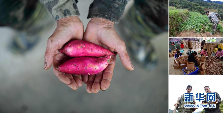 拼版照片:左圖為在大浪鎮(zhèn)桐里村,55歲的韋炳莊手捧剛剛收獲的高山紅薯;右上圖為韋炳莊在地里挖紅薯;右中圖為在縣城一個(gè)電商基地里,工作人員打包貧困戶種植的紅薯,準(zhǔn)備發(fā)往全國各地;右下圖為韋炳莊(左)在地里挖紅薯(照片均攝于11月18日)。今年,韋炳莊種植3畝高山紅薯,每畝年產(chǎn)3000多斤,他家已于2016年實(shí)現(xiàn)脫貧。 廣西融水苗族自治縣是國家扶貧工作重點(diǎn)縣,全縣“九山半水半分田”,生活生產(chǎn)環(huán)境較為惡劣,脫貧攻堅(jiān)任務(wù)艱巨,目前還有7.68萬貧困人口。面對(duì)經(jīng)濟(jì)發(fā)展落后、貧困面廣且程度深的現(xiàn)狀,當(dāng)?shù)匕衙撠毠?jiān)與創(chuàng)新產(chǎn)業(yè)扶持相結(jié)合,依托生態(tài)資源優(yōu)勢(shì),實(shí)施“特色產(chǎn)業(yè)富民行動(dòng)”,通過發(fā)展特色民族旅游、林下經(jīng)濟(jì)和特色養(yǎng)殖業(yè)等扶貧產(chǎn)業(yè),帶動(dòng)貧困群眾依靠勤勞的雙手,拔窮根摘窮帽,實(shí)現(xiàn)脫貧致富。據(jù)了解,目前全縣貧困戶參與特色產(chǎn)業(yè)發(fā)展的有2.9萬戶,扶貧產(chǎn)業(yè)覆蓋率達(dá)95%。 新華社記者 黃孝邦 攝