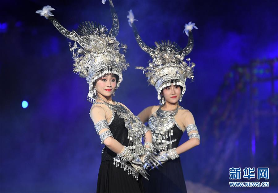 11月21日,演員表演歌舞《依依送客》。 當(dāng)日,廣西柳州市第一屆旅游產(chǎn)業(yè)發(fā)展大會暨2018第十八屆中國·融水苗族蘆笙斗馬節(jié)開幕式晚會在融水苗族自治縣舉行。 新華社記者 周華 攝