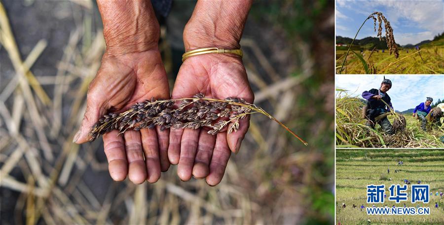 拼版照片:左圖為在安太鄉(xiāng)元寶村,80歲的賈榮專手捧剛剛收獲的香糯;右上圖為成熟待收的香糯;右中圖為賈榮專(左)在收割香糯;右下圖為村民們在收香糯(照片均攝于10月30日)。2017年,賈榮專加入村里的香糯種植合作社。香糯是廣西融水大苗山的特產(chǎn),它生長在高寒高海拔的特殊自然環(huán)境中,產(chǎn)量少,營養(yǎng)價值高。 廣西融水苗族自治縣是國家扶貧工作重點縣,全縣“九山半水半分田”,生活生產(chǎn)環(huán)境較為惡劣,脫貧攻堅任務(wù)艱巨,目前還有7.68萬貧困人口。面對經(jīng)濟發(fā)展落后、貧困面廣且程度深的現(xiàn)狀,當(dāng)?shù)匕衙撠毠耘c創(chuàng)新產(chǎn)業(yè)扶持相結(jié)合,依托生態(tài)資源優(yōu)勢,實施“特色產(chǎn)業(yè)富民行動”,通過發(fā)展特色民族旅游、林下經(jīng)濟和特色養(yǎng)殖業(yè)等扶貧產(chǎn)業(yè),帶動貧困群眾依靠勤勞的雙手,拔窮根摘窮帽,實現(xiàn)脫貧致富。據(jù)了解,目前全縣貧困戶參與特色產(chǎn)業(yè)發(fā)展的有2.9萬戶,扶貧產(chǎn)業(yè)覆蓋率達95%。 新華社記者 黃孝邦 攝