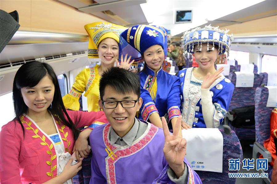 在廣西南寧站,身著民族服裝的乘客搭乘動(dòng)車準(zhǔn)備出行(2013年12月30日攝)。 廣西壯族自治區(qū)成立60年來,鐵路建設(shè)發(fā)生翻天覆地的變化。來自中國鐵路南寧局集團(tuán)有限公司的數(shù)據(jù)顯示,1958年廣西鐵路總里程為1346.3公里,如今廣西鐵路總里程達(dá)5191公里。廣西與周邊相鄰省份間實(shí)現(xiàn)動(dòng)車“公交化”開行。此外,北部灣港—重慶班列、東盟海產(chǎn)品冷鏈班列、“百色一號(hào)”果蔬專列等的開通和運(yùn)營(yíng),強(qiáng)化了鐵路供給的針對(duì)性和有效性。鐵路成為助推廣西經(jīng)濟(jì)社會(huì)快速發(fā)展的“大動(dòng)脈”。 新華社記者周華攝