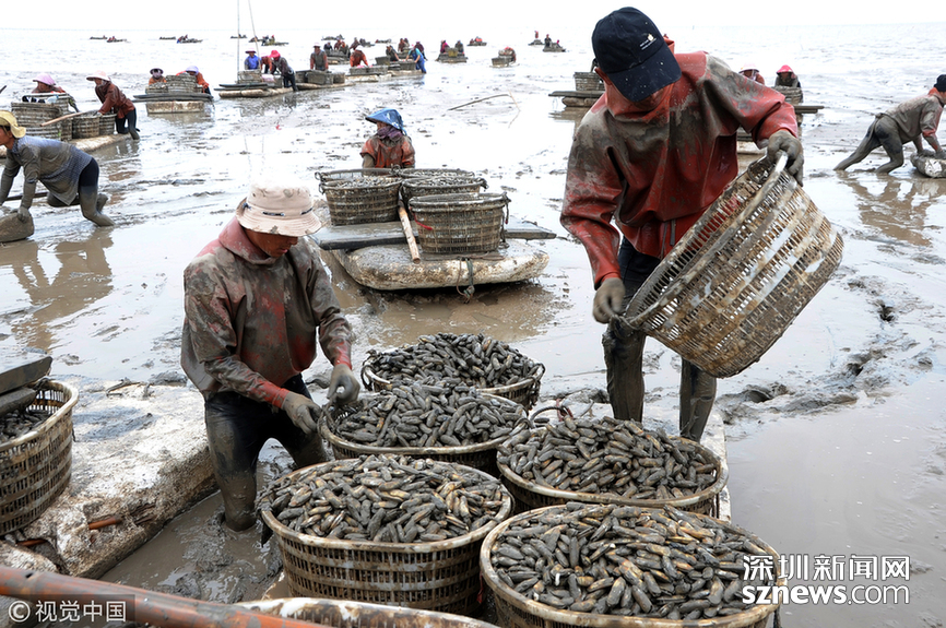 2018年5月30日,漁民們?cè)诮K連云港沿海地區(qū)海邊的灘涂上將剛收獲的海蟶運(yùn)送上岸裝箱外運(yùn)。