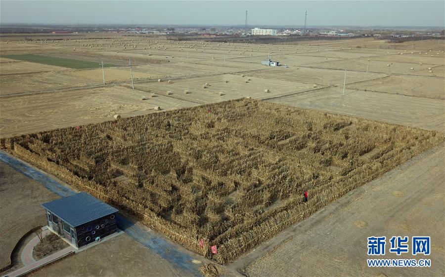 11月28日,游客在昌黎縣劉臺(tái)莊鎮(zhèn)白棗林村的玉米秸稈迷宮內(nèi)游玩(無(wú)人機(jī)拍攝)。 新華社記者楊世堯攝
