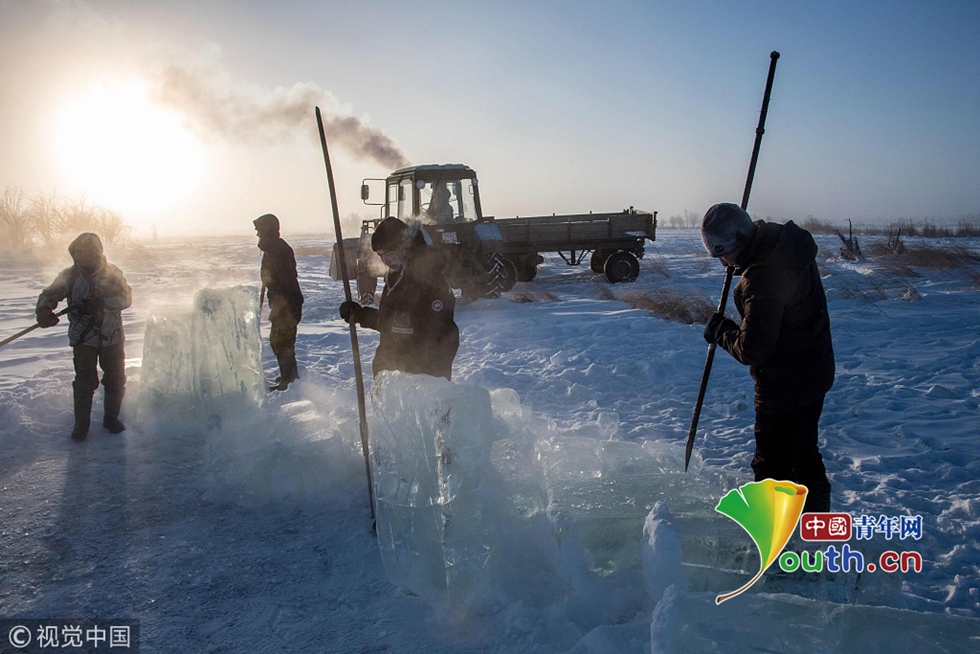 當(dāng)?shù)貢r間2018年11月27日,雅庫茨克,零下41攝氏度左右的氣溫下,村民在當(dāng)?shù)氐囊粋€湖中采集冰塊。當(dāng)?shù)睾芏嗳艘蕾囉谌诨鶋K解決供水,因為多年凍土覆蓋地區(qū)冬季氣溫極低,沒有其他的方式供應(yīng)水。