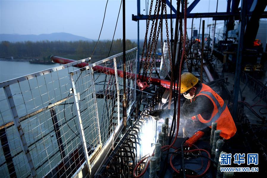 11月17日,施工人員在商合杭鐵路跨淮河特大橋合龍現(xiàn)場作業(yè)。