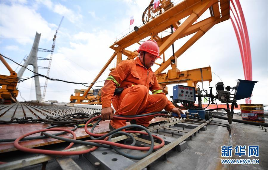 11月3日,工人在進行大橋合龍收尾工作。 新華社記者 郭程 攝