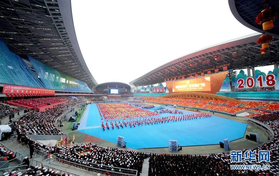 12月10日,廣西壯族自治區(qū)成立60周年慶祝大會在廣西體育中心隆重舉行。這是慶祝大會上的群眾文藝表演。 新華社記者 陳建力 攝