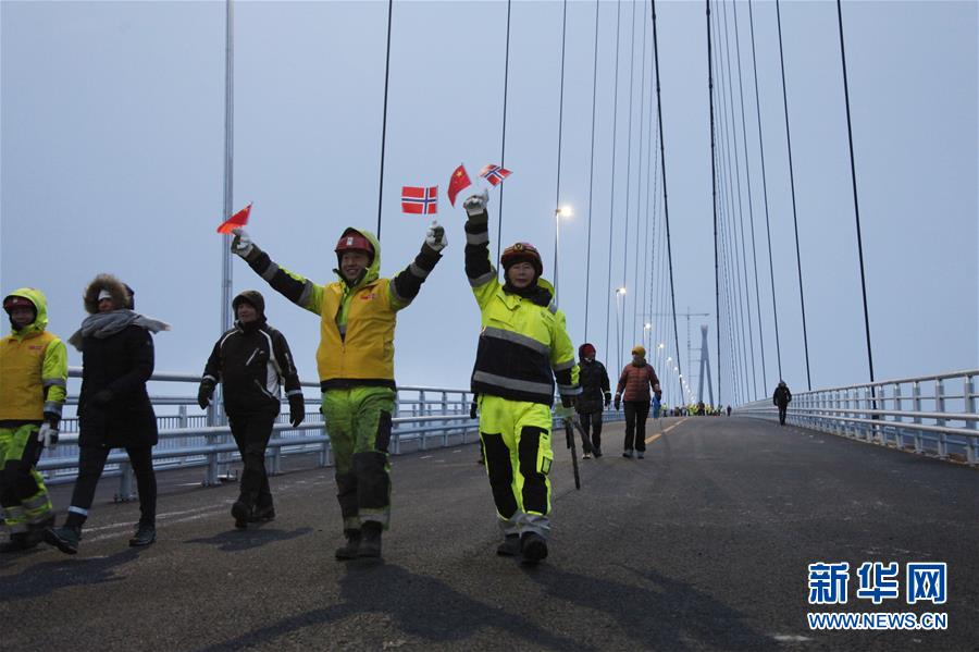 12月9日,中國(guó)工人和挪威市民在挪威哈羅格蘭德大橋上行走。 新華社記者梁有昶攝