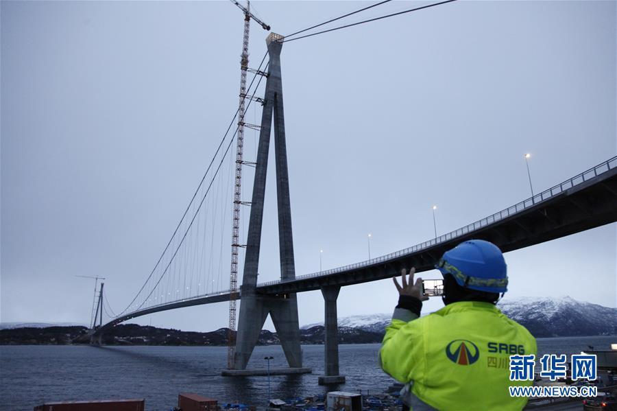 12月9日,一名中國工人拍攝挪威哈羅格蘭德大橋。新華社記者梁有昶攝