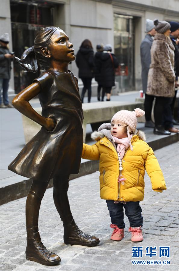 12月10日,在美國(guó)紐約,一名小女孩端詳紐約證券交易所前的“無(wú)畏女孩”銅像。  新華社記者 王迎 攝