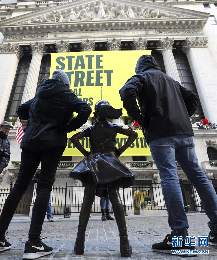 這是12月10日在美國(guó)紐約證券交易所前拍攝的“無(wú)畏女孩”銅像。  新華社記者 王迎 攝