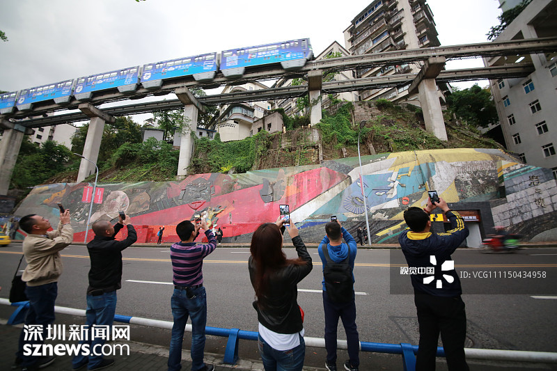 2018年4月14日,重慶,不少游客“李子壩穿樓輕軌”附近拍照。