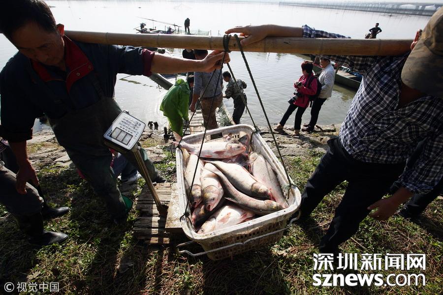 江蘇揚州,漁夫將魚撈出過秤。