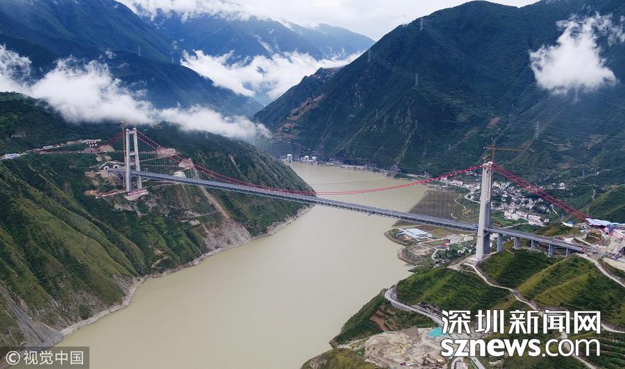大橋擁有2個“第一”:主跨1100米,成為川藏在建第一大跨徑鋼桁梁懸索橋;雅安岸隧道式錨碇長159米,更是成為世界上在建第一長。