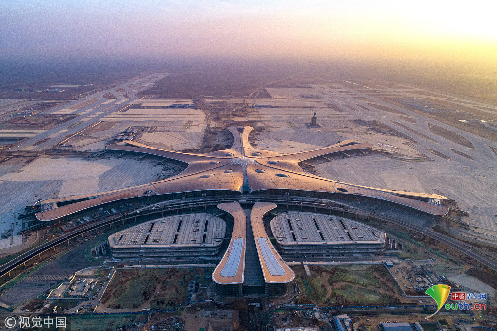 中國青年網(wǎng)北京12月20日電 2018年12月19日,北京大興國際機場航站樓的屋面已基本完工,一只金色“鳳凰”完整地出現(xiàn)在北京城南。航站樓的室內(nèi)裝修在有條不紊的推進(jìn)中。