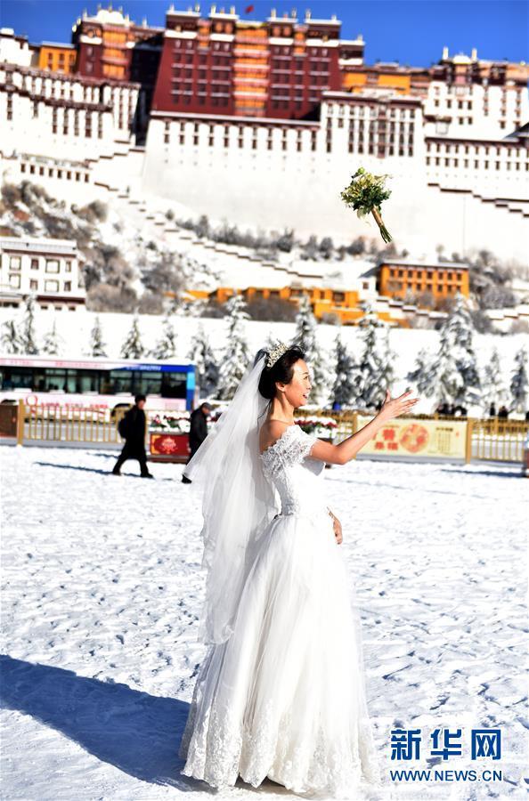 12月19日,一名女士在布達拉宮廣場上拍婚紗照。 12月18日,西藏拉薩市迎來今年入冬以來的首場降雪。19日清晨,拉薩雪后初霽,處處銀裝素裹,盡顯雪域高原之美。 新華社記者覺果攝